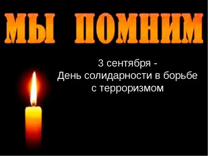 3 сентября в России День солидарности в борьбе с терроризмом. День скорби. Мы вспоминаем сегодня всех, кто погиб от рук террористов. Это обычные жители нашей страны, взрослые и дети. И те, кто погиб, выполняя свой долг в ходе спасательных операций. Россия скорбит о безвинно погибших соотечественниках. Сегодня во всех городах и селах нашей большой страны в память о них зажгутся свечи.