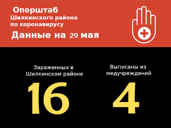 По информации оперативного штаба по Шилкинскому району на 29 мая, количество лабораторно подтвержденных случаев заражения COVID-19 на территории района увеличилось до 16. Еще 1 новый случай зафиксирован в п. Первомайский. Заболевания зарегистрированы в Шилке, п. Первомайский, с. Казаново и с. Нижняя Хила. Все заболевшие проходят лечение в специализированных моностационарах региона.