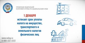 Управление Федеральной налоговой службы по Забайкальскому краю в рамках реализации плана мероприятий «дорожная карта» по организации межведомственного взаимодействия с целью публичного информирования населения по вопросам налогообложения для повышения уровня «налоговой грамотности», в том числе в связи с исчислением налога на имущество исходя из кадровой стоимости сообщает, что срок уплаты земельного и транспортного налогов, а также налога на имущество физических лиц за 2016 год истекает 1 декабря 2017 года.