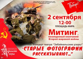 Администрация городского поселения "Шилкинское" приглашает Вас принять участие в митинге, посвященному окончанию Второй мировой войны, который состоится 2 сентября 2017 года на площади Мира. Начало в 12:00.