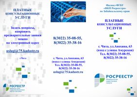Филиал ФГБУ «ФКП Росреестра» по Забайкальскому краю (далее – Филиал) просит Вас довести информацию до сотрудников и местного населения о том, что теперь Кадастровая палата предлагает платные информационные, справочные, аналитические и консультативные услуги в сфере недвижимости: