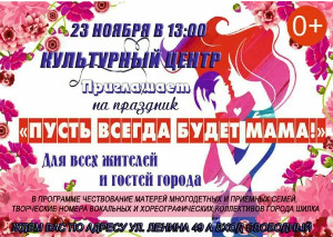 Культурный центр приглашает всех принять участие в праздничном мероприятии 23 ноября в 13.00 ч. Вход свободный.
