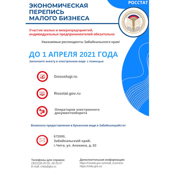 По всем интересующим вопросам Вы можете обратиться в отдел статистики предприятий, ведения Статистического регистра и общероссийских классификаторов Забайкалкрайстат по телефону 28-20-55 или по адресу электронной почты chita@gks.ru.