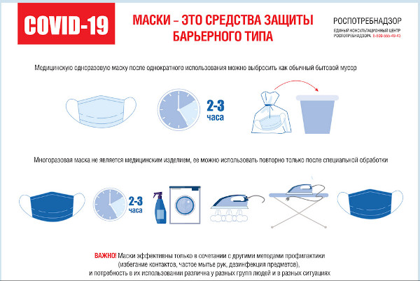 Роспотребнадзор напоминает, что маски - это средства защиты барьерного типа. Они помогают защитить ваш организм от возбудителей ОРВИ и других респираторных заболеваний, передающихся воздушно-капельным путем. При этом важно помнить, как правильно использовать маску. Об этом более подробно можно узнать из ролика, подготовленного Роспотребнадзором и порталом Стопкоронавирус.